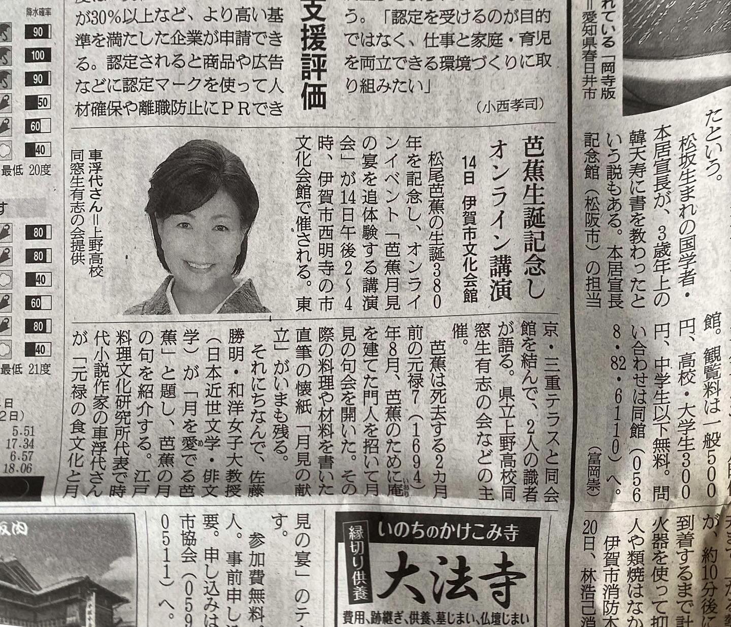 朝日新聞伊賀版に「芭蕉月見の宴 追体験の会」の紹介記事掲載