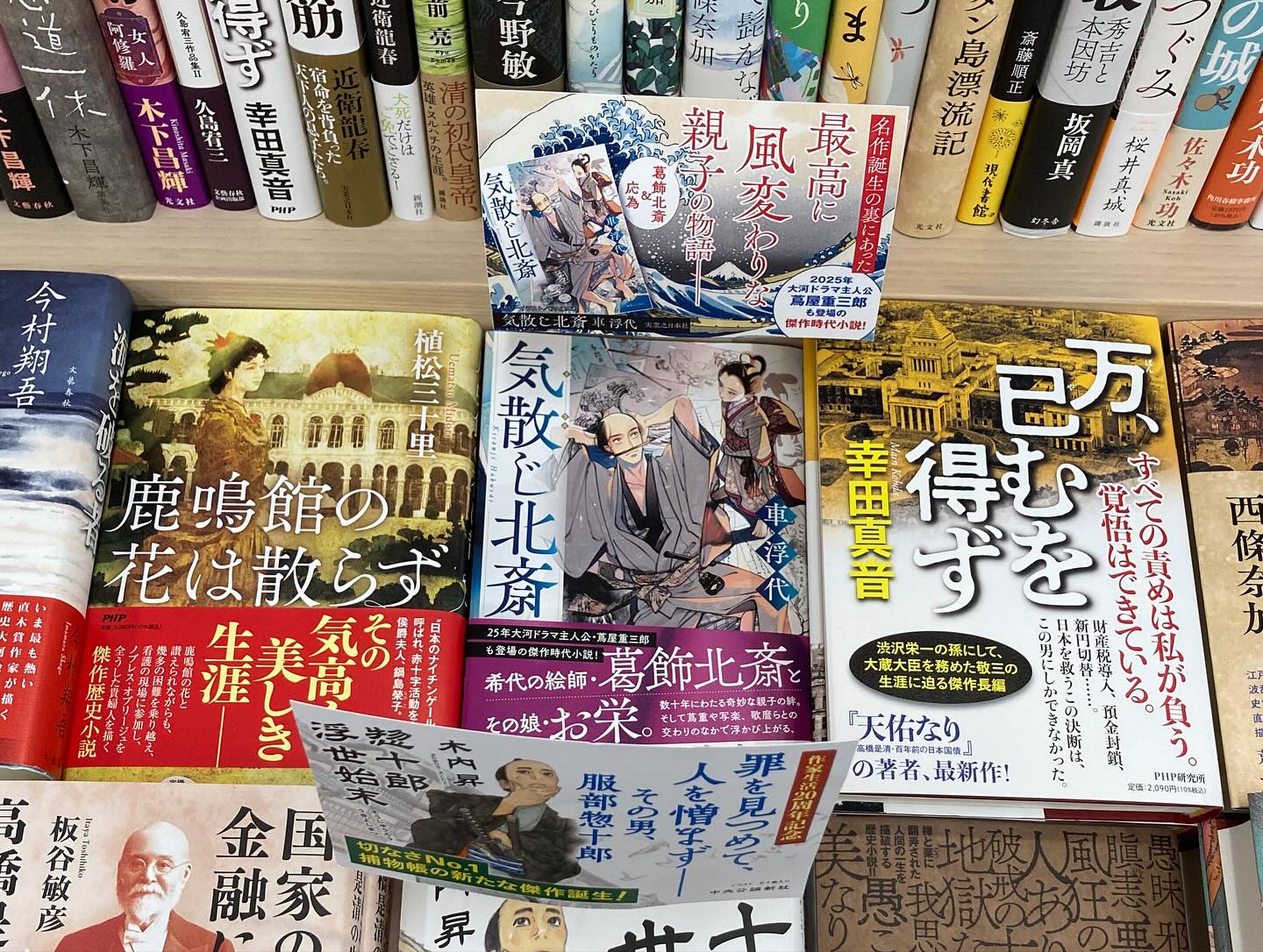 紀伊國屋書店新宿本店ではphp文庫コーナーに『蔦屋重三郎と江戸文化を創った13人』が、時代小説コーナーに『気散じ北斎』実業之日本社 がPOP付きで積まれておりました。プッシュいただき、ありがとうございます。